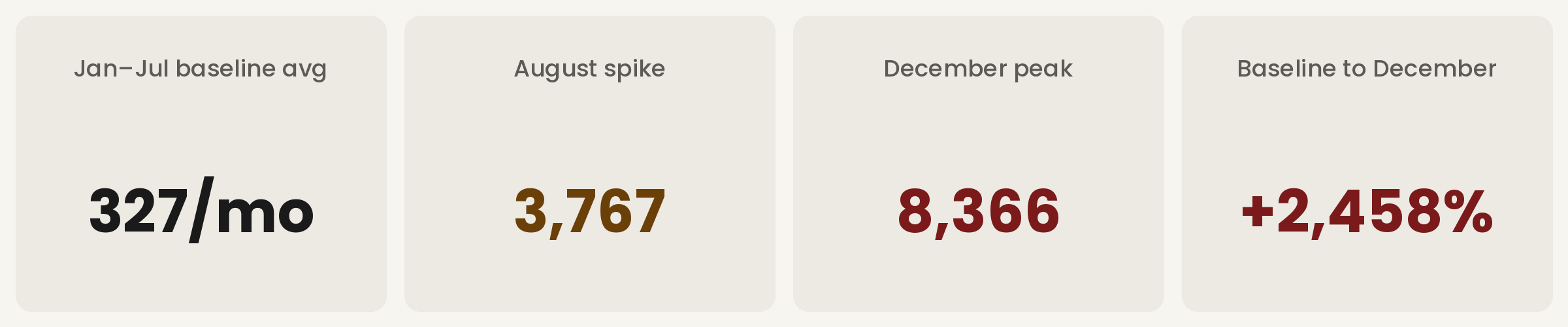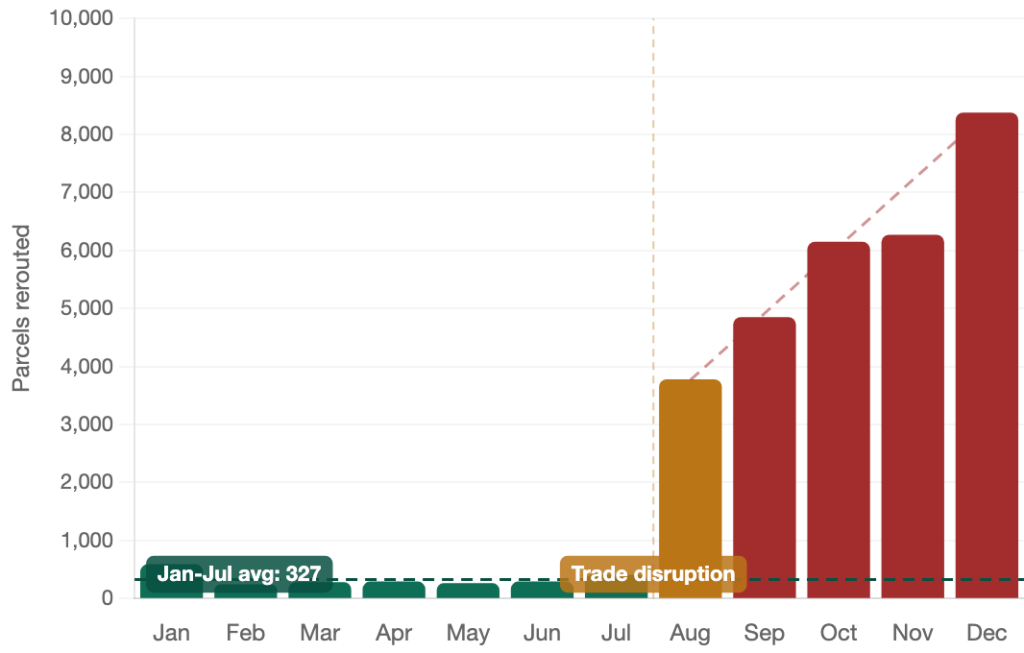 Rerouting needs surged from a baseline of roughly 300 parcels per month to over 3,700 in August alone, then continued accelerating through year-end, reaching 8,366 in December. That represents a 2,458% increase from baseline with no plateau in sight. Trade volatility used to be the exception: hurricane seasons, labor strikes, capacity crunches during peak periods. It has become the standard operating environment, and it is still intensifying.
