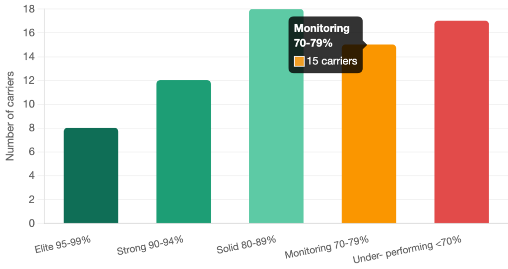 A multi-carrier network maximizes on-time delivery by concentrating volume among proven performers, shifting away from underperformers in real time, and maintaining the ability to reroute 30% of volume within 48 hours. Single-carrier models offer none of that flexibility until the contract expires.