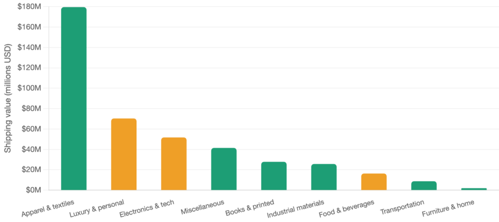 Total shipping value analyzed: $421.3M across nine primary categories: apparel and textiles, luxury and personal items, electronics and technology, miscellaneous, books and printed materials, industrial materials, food and beverages, transportation, furniture and home.