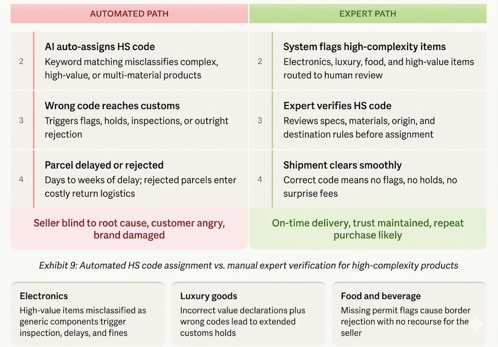 The fix: add human expert review for high-complexity or high-value products. Manual HS code verification ensures correct classification, smooth customs clearance, and successful transactions.