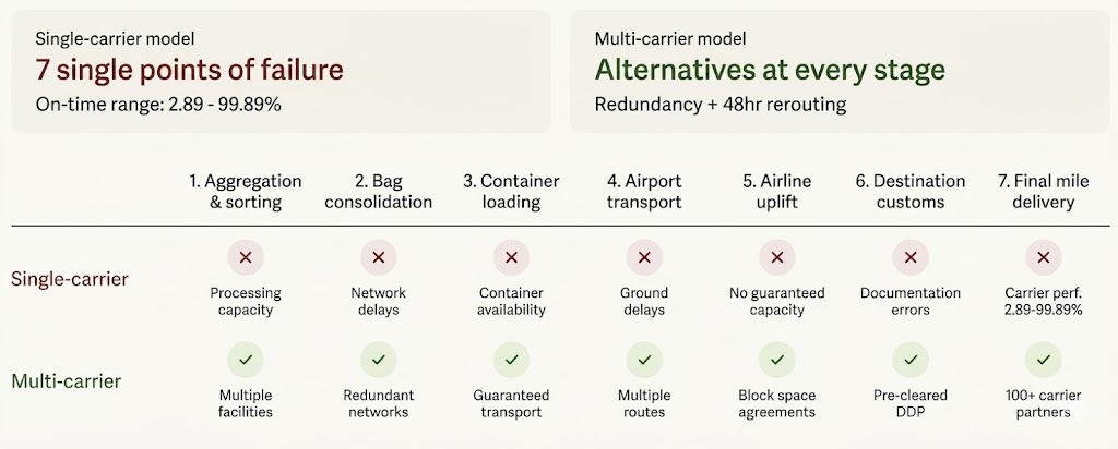 In August 2025, a trade disruption exposed the hidden cost of single-carrier dependency. Brands locked into volume commitments faced either breaching contracts or halting operations. Brands with diversified carrier networks rerouted shipments and continued servicing customers without disruption.