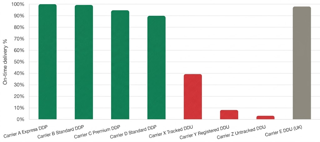Pre-clearance via DDP effectively eliminates the customs delays and surprise fees that cause DDU failures. The performance advantage is dramatic and consistent across carriers.